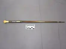 1. (ไม้~) staff used as a weapon, symbol of authority, or walking cane, sometimes incorporating a concealed blade similar to a swordstick.