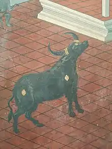 mural painting of the bull ทรพี at the Temple of the Emerald Buddha, Bangkok