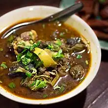 a spicy dish of chicken offal mixed with vegetables and others, served in a soup