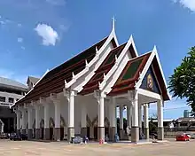 - (Buddhism) monastic auditorium marked by boundary stones called สีมา (sǐi-maa), occupied by priests for conduct of religious services, as ordination, recital of Prātimokṣa, etc.