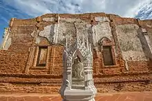 A boundary stone housed by a shrine in front of the ruins of an auditorium of Wat Yai Chom Prasat, Ayutthaya