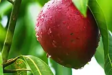 Borrowed from English mango, from Portuguese manga, from Malay mangga, ultimately from a South-Dravidian language, perhaps Tamil மாங்காய் (māṅkāy, “(unripe) mango”); see there for more.