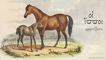 | Accusative | τὸν, τὴν ῐ̔́ππον tòn, tḕn híppon |