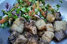 From Proto-Tai *n.mɤːꟲ (“meat, flesh”). Cognate with Northern Thai ᨶᩮᩬᩨ᩶ᩋ, Lao ເນຶ້ອ (nưa), Lü ᦵᦓᦲᧉ (noe²), Khün ᨶᩮᩨ᩶ᩬ, Shan ၼိူဝ်ႉ (nô̰e), Thai เนื้อ (nʉ́ʉa), Bouyei noh, Zhuang noh, Nong Zhuang nowx or nwx, Saek หมร้อ.