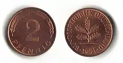 Zweipfennigmünze f (genitive Zweipfennigmünze, plural Zweipfennigmünzen)