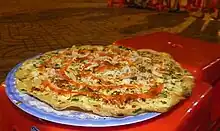 - (cooking) a rice paper pizza (but with the sauce typically drizzled on top)
