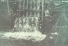 - The man who threw the handle into the air then crosses over to the starboard side of the skiff and the three men together put all their weight onto the brailer handle and drive it down into the sack.