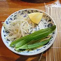 Chadon beni leaves (bottom) on a dish together with bean sprouts and a wedge of lemon, served as a condiment with Vietnamese food.