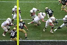 - (US, uncountable) American football: a game played on a field 100 yards long and 53 1/3 yards wide in which two teams of 11 players attempt to get an ovoid ball to the end of each other's territory.