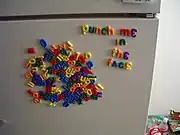 - A decoration attached to a magnet, displayed on the outside of refrigerator doors, sometimes used to attach a written reminder.