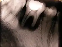 - tooth root (part of a tooth extending into the bone holding the tooth in place)