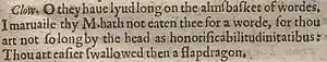 - Clow[ne]. O they haue lyud long on the almſbaſket of vvordes. I maruaile thy M[aster] hath not eaten thee for a vvorde, for thou art not ſo long by the head as honorificabilitudinitatibus: Thou art eaſier ſvvallovved then a flapdragon.