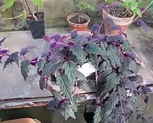 - An ornamental plant, Gynura aurantiaca, grown for its attractive foliage, which is covered with soft bright-purple hairs.