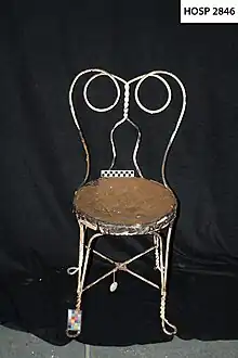 - A chair of the kind that patrons might occupy at a soda fountain counter, typically having a round seat and a decorative back made from narrow strips of metal.